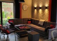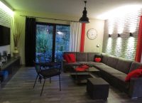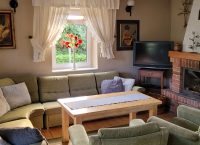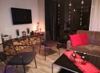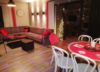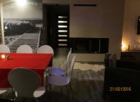 - Duży salon z kominkiem, meble wypoczynkowe, TV, radio, lampa i kula dyskotekowa