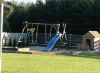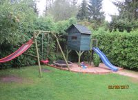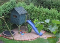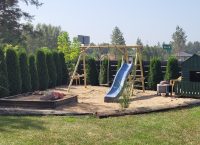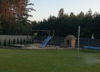 - plac zabaw dla dzieci, piaskownica, zjeżdżalnia, drewniany domek, huśtawki,